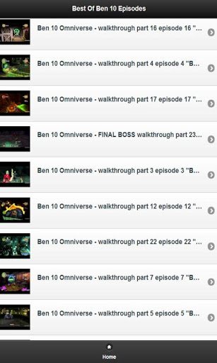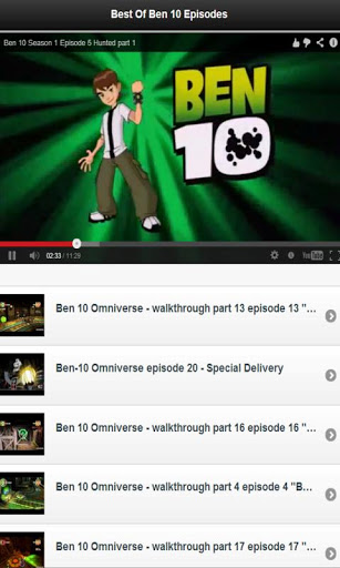 This is A Free App To Watch Your Favorite Kids Action Hero Episodes in HDBen 10 is an American animated series created by Man of Action (a group consisting of Duncan Rouleau, Joe Casey, Joe Kelly, and Steven T. Seagle), and produced by Cartoon Network Studios. The series is about a boy named Ben Tennyson who gets a watch-like alien device called the "Omnitrix" (the prefix omni means all). Attached to his wrist, this allows him to transform into various alien creatures.The pilot episode aired on December 27, 2005, as part of a sneak peek of Cartoon Network's Saturday morning lineup. The second episode was shown as a special on Cartoon Network's Fridays on January 13, 2006, and the final regular episode aired on April 15, 2008. The series gradually became popular among audiences, gradually evolving into a franchise. Ben 10 was succeeded by Ben 10: Alien Force, which itself was succeeded in April 2010 by Ben 10: Ultimate Alien. A new series called Ben 10: Omniverse premiered in September 2012.PremiseBen 10 centers around Ben Tennyson (Tara Strong), a ten-year-old boy on a cross-country summer vacation, with his cousin Gwen (Meagan Smith) and their grandfather Max (Paul Eiding). On their first night camping in their grandfather's RV affectionately named the "Rust Bucket," Ben finds an alien pod with a mysterious watch-like device named the Omnitrix. The device then permanently attaches itself to his wrist giving him the ability to transform into a variety of alien life-forms each with its own unique skills and powers. With his newfound super powers Ben has to learn the responsibilities of being a hero. During their vacation, the Tennysons are attacked by various enemies ranging from space aliens to supernatural entities.keywords: videos for boys, cartoon videos,cartoons for kids,cartoons for boys,videos for kids, ben 10 omniverse************DISCLAIMER: The content provided in this application is hosted on youtube and is available in the public domain. We have not uploaded any videos to YouTube. This application is just an organized way to browse and view YouTube videos in another way. This app is unofficial and is simply a shortcut to the free information offered by youtube.Any problems or suggestions, please contact us.