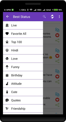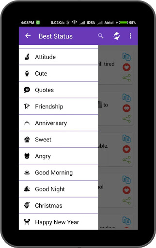 The best status app and huge status collection of statuses for all occasions. The Best Status Collection 2019 have categories of best status like Diwali, Christmas quotes 2018, Best attitude status and quotes, Best love status and quotes, Latest birthday status, Good morning best status, etc.