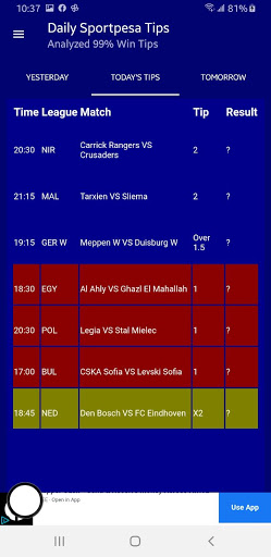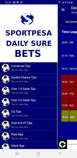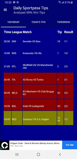 The app offers daily betting tips for free ranging from the following markets. 1. Over 1.5 tips 2. Over 2.5 tips 3 . Goal Goal tips 4 . Direct win tips