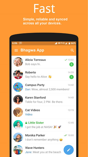 Bhagwa App Messenger is an UNOFFICIAL messaging app that uses Telegram's API You can call and message your friends from your contacts if they have Bhagwa App