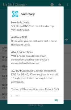 Big DNS Changer app creates a VPN (Virtual Private Network) on your device to be able to configure the default DNS server when using it on Wi-Fi and mobile networking, leaving out the need to root.