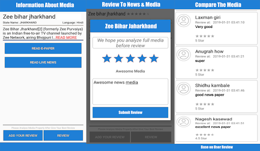 App Is providing the user review audit and rating system, User Can Upload the media and News and others will provide his opinion and rating on News and media with the rating.