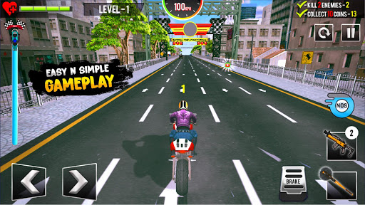 Bike Hero- Attack & Race on Super Bikes offers instant click and touch executions. Bike Hero- Attack & Race on Super Bikes game is a high-utility thrilling and adventurous game carrying out racing on traffic highway along with shooting and targets to be accomplished!