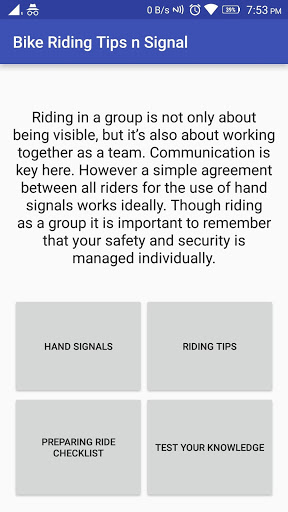 Here you will have the various hand signals and tips. Many features are pending to improve your driving skills in group motorcycle rides