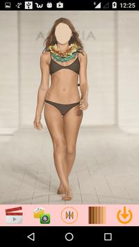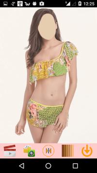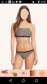A bikini is usually a women's abbreviated two-piece swimsuit with a bra top for the chest and panties cut below the navel.The basic design is simple: two triangles of fabric on top cover the woman's breasts and two triangles of fabric on the bottom cover the groin in front and the buttocks in back.