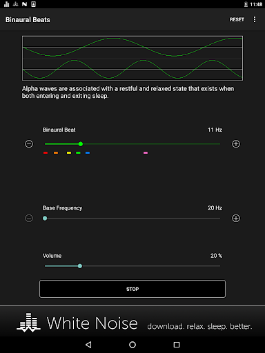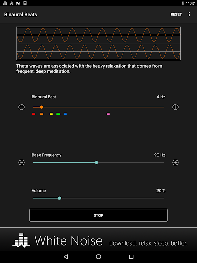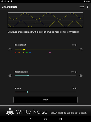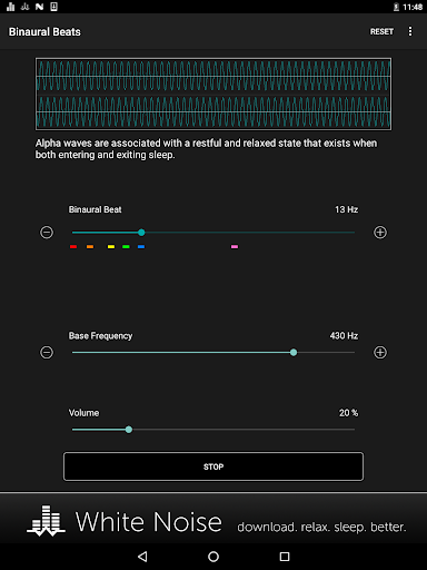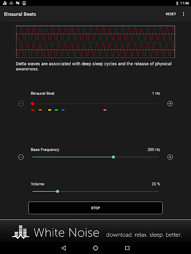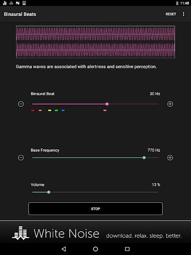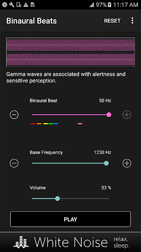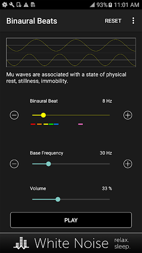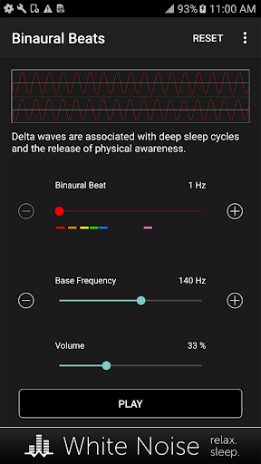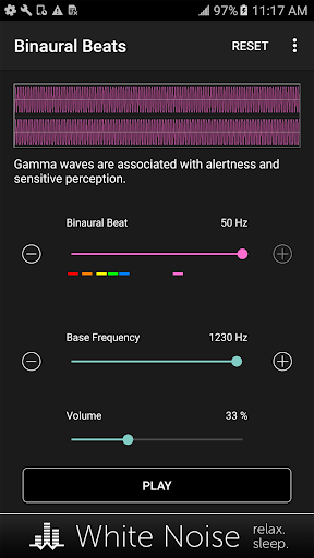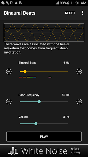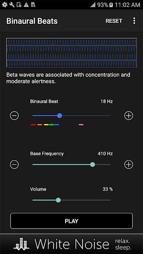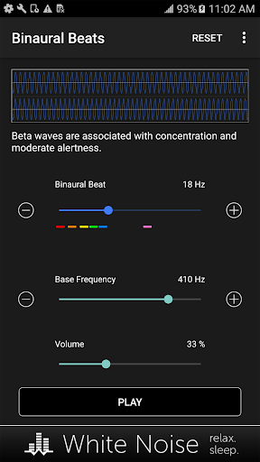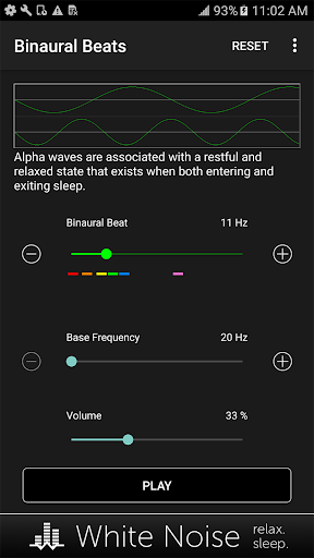 Drag slider to select a desired Binaural Beat from 1 to 50 Hz. Next, drag the base frequency to a tone that sounds pleasant to your ears. The binaural beat is generated around this base frequency. Adjust device volume using the on-screen volume slider to a comfortable level. Toggle audio playback using the Play/Pause button.