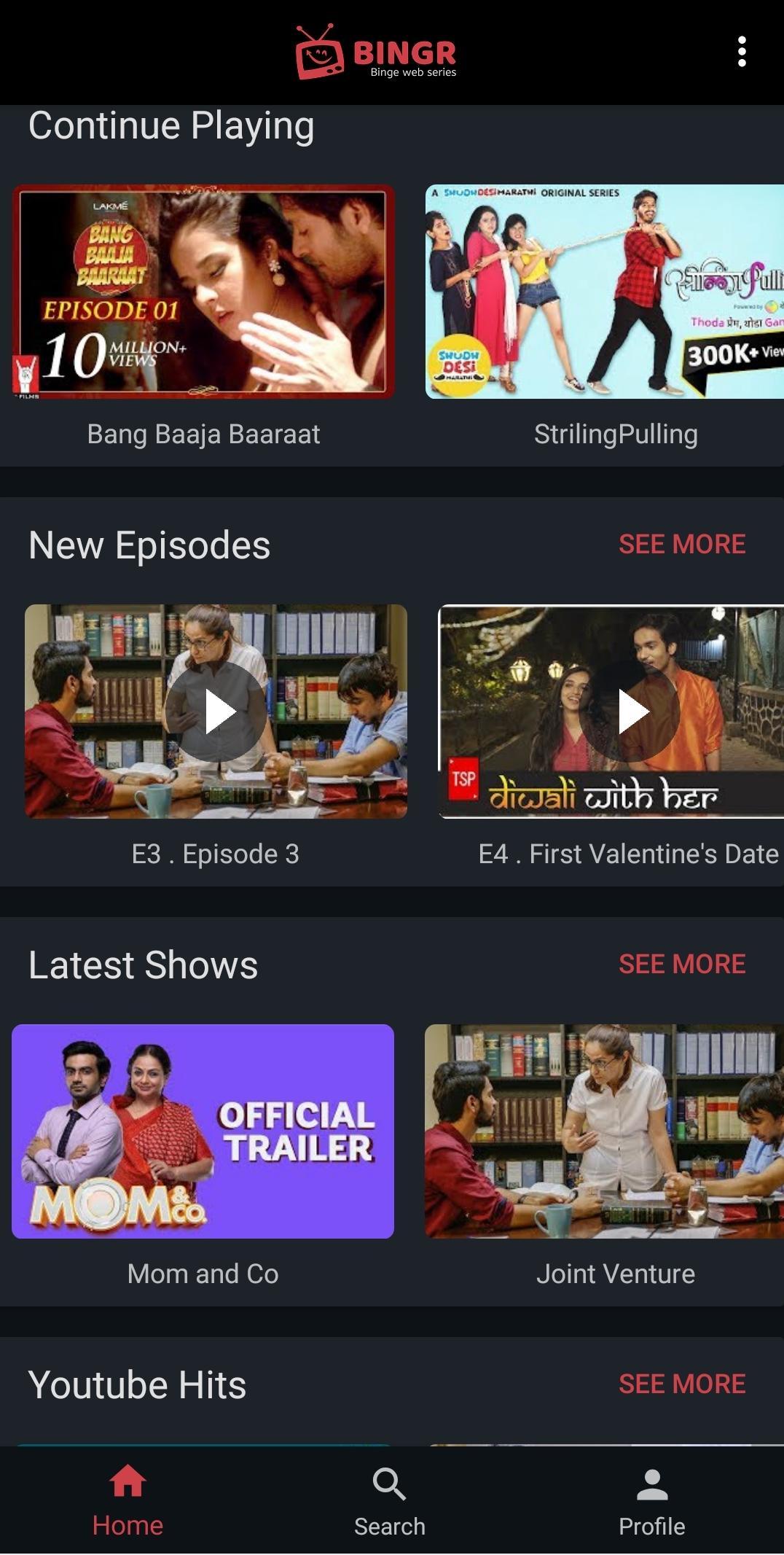 Bingr show listing spans across various genres such as romance, comedy, thriller, horror, mystery and more. The shows are available in multiple Indian languages:- Hindi, Bengali, Telugu, Marathi, Tamil and other vernacular languages.