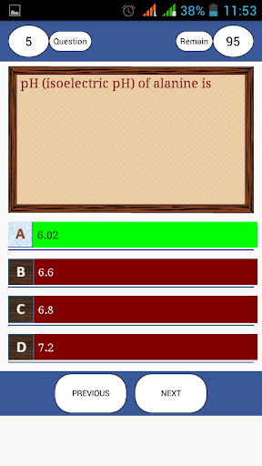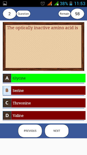 there are 8 chapters , each chapters has 100 questions. green option after selecting option indicates the correct answer. red for wrong . each right answer carry one mark. at the end of quiz, there is result option.