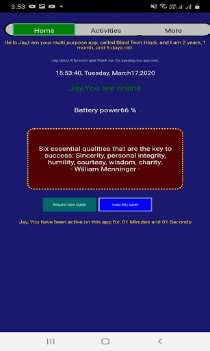 Also you can know your device's battery status, date time and many more. interesting things on the home screen of Blind Tech Hindi multipurpose app.