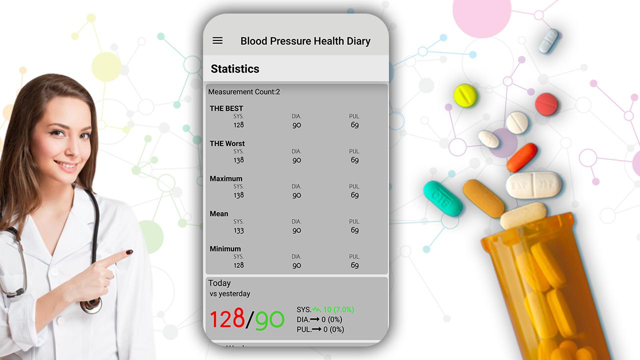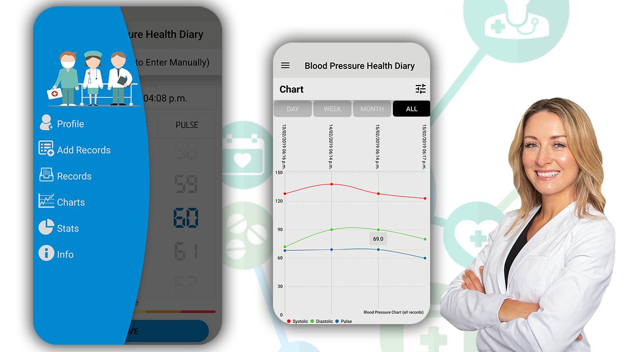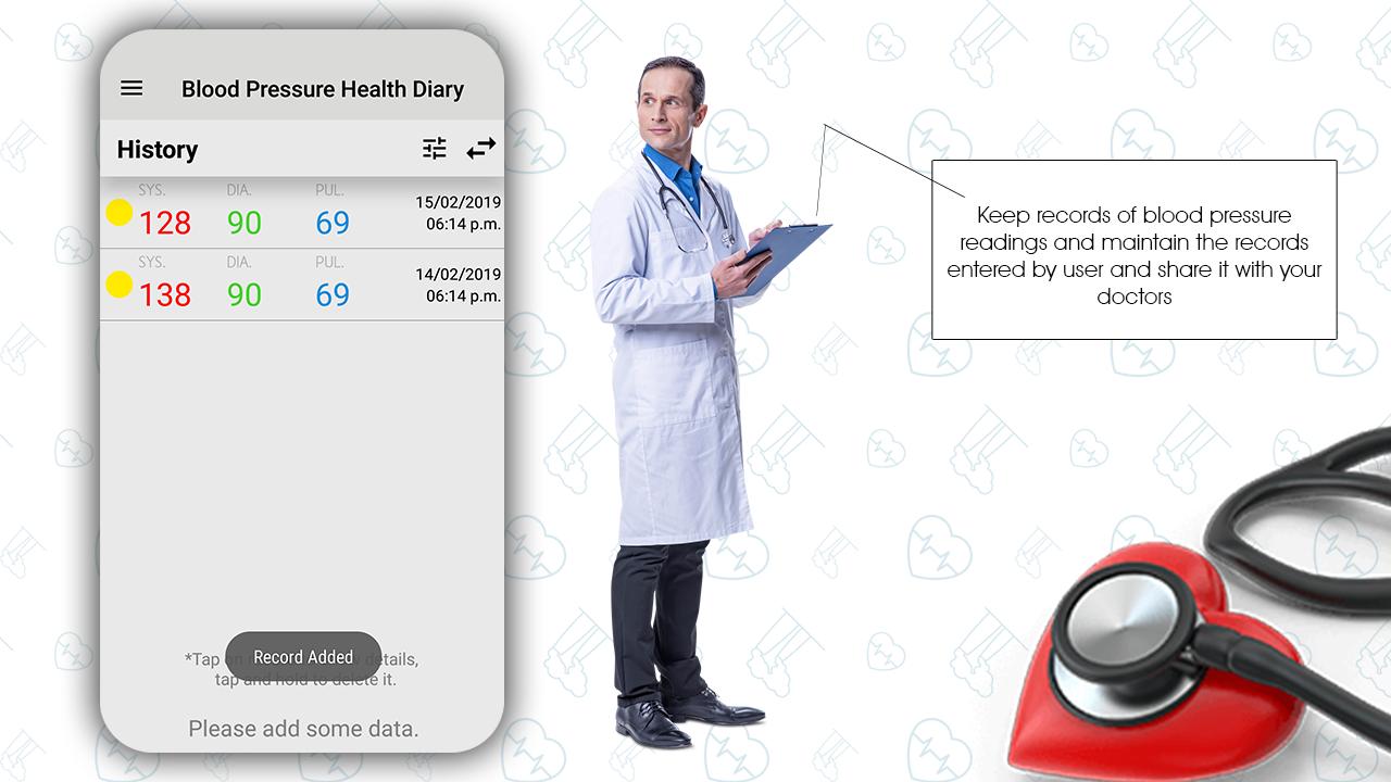 The app lets you log blood pressure average readings, view trends & send reports to your physician or professional healthcare provider. This app DOES NOT measure blood pressure nor Blood Pressure History. To measure blood pressure reliably, use a clinically-validated blood pressure monitor. Blood pressure is usually expressed in terms of the systolic pressure (maximum during one heart beat) over diastolic pressure (minimum in between two heart beats) & is measured in millimeters of mercury (mmHg), above the surrounding atmospheric pressure. Diary gives you good data base facility to save weight and pulse history date wise and compare the entries. You can manage and saved your report of blood pressure in a single blood pressure Diary app. Control your blood pressure with multiple build-in features like measurements analysis, statistics, graphs, comprehensive reports your doctor will love and many other tools high or low blood pressure! Understand what the numbers mean and monitor blood pressure trends with statistics and interactive charts. Add tags to each record – so with the help of diabetes logs you will find out your diabetes dynamics, for example, before meals, before breakfast, after lunch, after meals, In Morning, evening etc. Actually, this blood pressure monitor application gives you the information of records saved long back this application shows you high blood pressure, low Blood Pressure and Sugar and normal blood pressure.