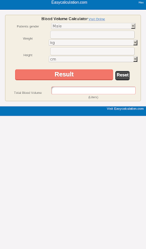 Blood Volume Calculator to estimate normal blood volume in male and female.