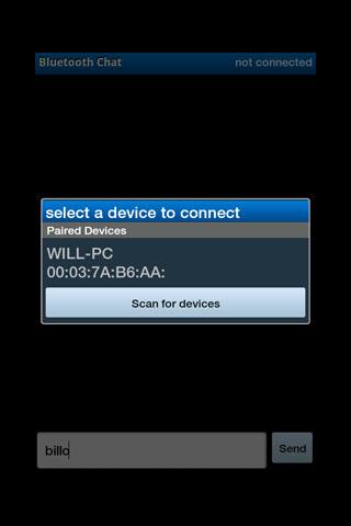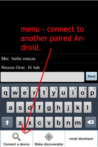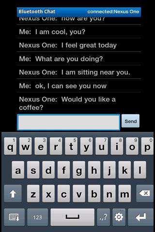 A simple text bluetooth chat for 2 paired android .It is Bluetooth text chat only.This is the standard Android Bluetooth text chat application.I think Androids are very good at Bluetooth pairing with each other. I paired a Nexus One with a Samsung Galaxy Tab with no problem. I used the Android 39;settings39; to do it easily.You must Bluetoothpair two Androids FIRST. Only after pairing can you open the chat applications in both the paired Android phones or tablets. Then open the chat app menu at the bottom menu button and press connect on one of the paired Androids.If you do not know how to pair two Androids from Android settings then don39;t bother because it will be too difficult for you. If you do know how to pair, then this application is easy to use and works well.email me for the source code if you want it or any comments for me.: Have fun.