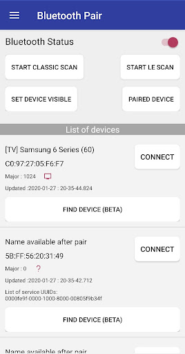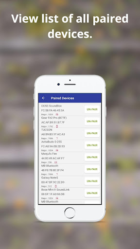 Bluetooth Finder and BLE Scanner app help to scan/pair/unpair/view UUIDs GATT service & characteristics read/set a device discoverable/Bluetooth Signal Strength.