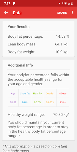 The most accurate body fat percentage calculator with very interactive results which include your fitness level, your healthy weight range based on your lean body mass (LBM) and how much fat you should lose or gain in order to be in the healthy weight range.