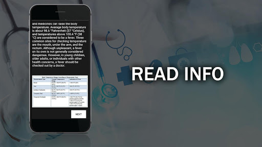 Body Temperature Measure App information, gives you the maximum & minimum range of the given values in the app to store the previous records and gives you the information about your body temperature which are given according to the thermometer.