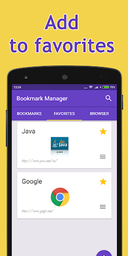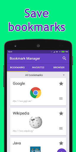 Bookmark Manager is a handy application to store bookmarks of your favorite sites from different popular browsers. To save your first bookmark you just need to click on the share button in your mobile browser, or use the built-in browser.