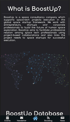 BoostUp is a space consultancy company that supports space-tech project execution in the global space startup framework. We work with entrepreneurs, startups and corporate professionals to build the future of human space exploration. BoostUp aims to facilitate professional relation among space tech professionals using project-based collaborations and also links the project needs to space startups for successful execution.