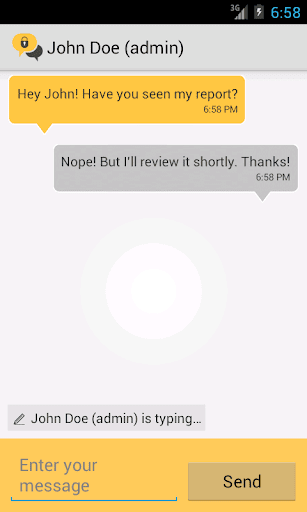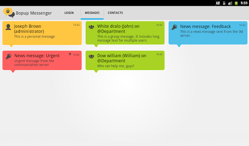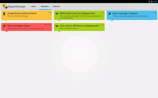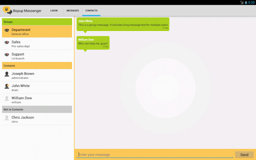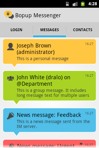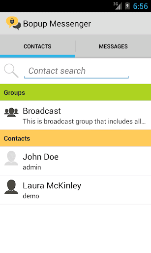 This app allows to exchange secure instant messages and communicate instantly with other users connected to the same Bopup Communication Server software from mobile and desktop messaging clients within same office network, corporate VPN or Internet.