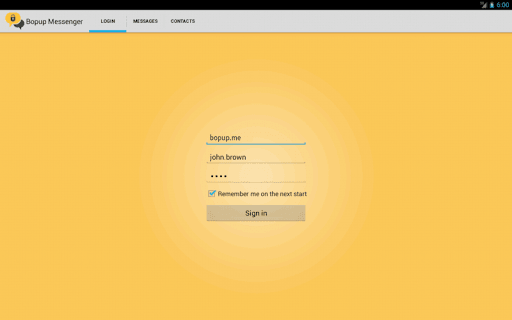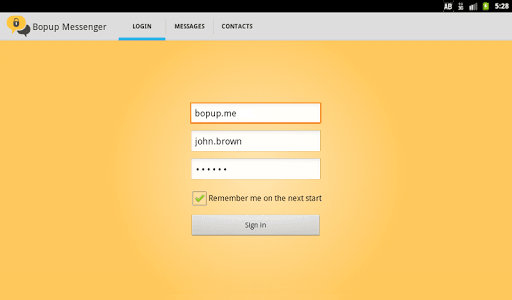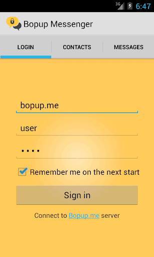 Evaluation of this instant messenger app is possible via shared communication server running on Bopup.me. In this case this address must be entered as a name of the IM server on Login screen and one from test user accounts can be used. For more information please visit https://www.bopup.me website.