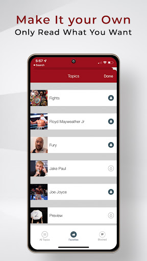 * Customized news feed - choose your favorite topics or simply block the topics you don't want to see. Easily build your very own boxing news feed.