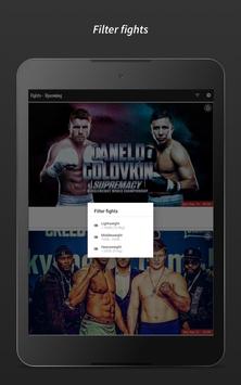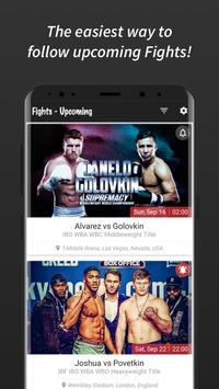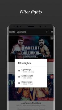 - The simplest way to follow boxing fights. You can filter them by boxer weight (lightweight, middleweight, heavyweight) and see only those fights you are interested at. Also, with one swipe you can see finished fights and check the winners.