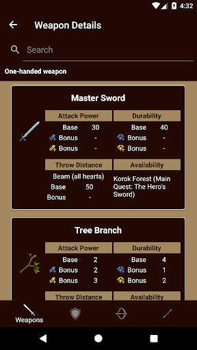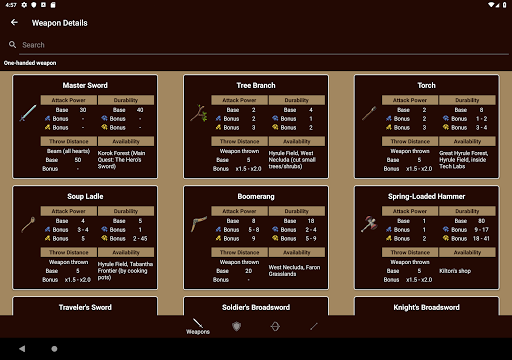 - Weapon Details: List of all weapons, bows and shields (including amiibo unlocks) with the specific attack power, durability and their possible bonus attributes