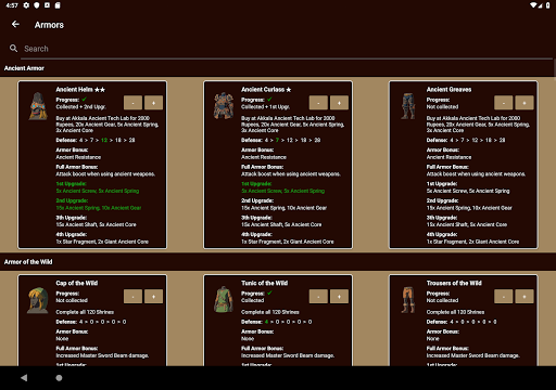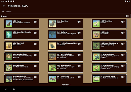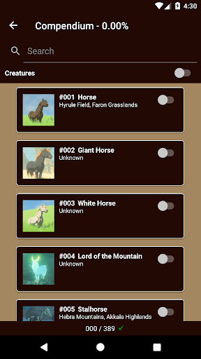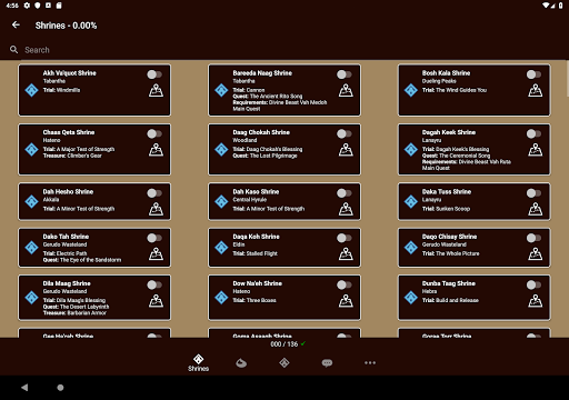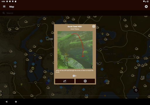 A short description of each Shrine, Side Quest, Shrine Quest and Korok Seed is included. Shrines, Side Quests, Shrine Quests, Minibosses, Treasures and Korok Seeds can also be tracked with a check list. You can check or uncheck your checklist entries even from the icon shown on the map.
