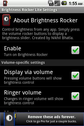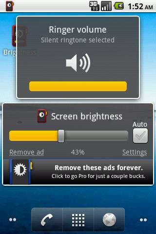 Control screen brightness from any app. Simply press the volume rocker to display a brightness slider in addition to changing the volume. Or use the home widget or notification icon.best in android 2.2, slower and requires change in volume in 1.52.1.v1.2 Integrates with auto brightness and misc bug fixes.
