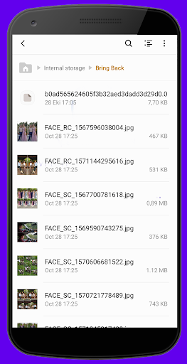 Thanks to the Bring Back application, you can save the photos and videos that both you created in your phone and you recevied/ downloaded or loaded through the communication/ internet and social media devices ( bluetooth, internet browsers, whatsapp, facebook, messenger, viber, telegram) easily.