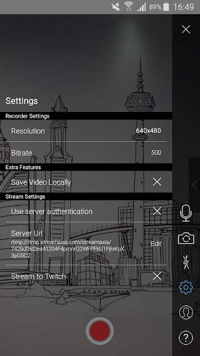 Don't worry if you do not have an RTMP server ready, as you can use ours. In the Settings Screen under Server URL there is a predefined URL with a random streamName. You can watch and share your live streaming here: http://play.streamaxia.com/streamName