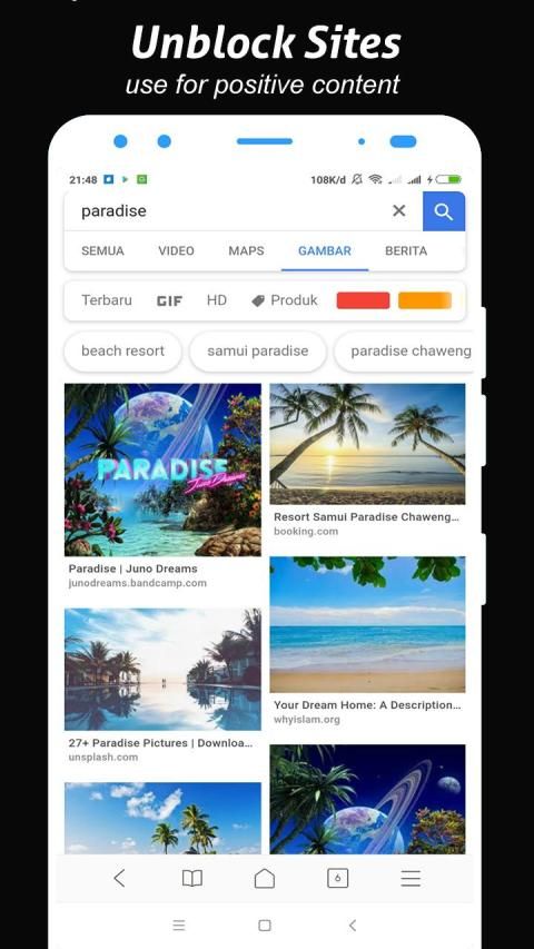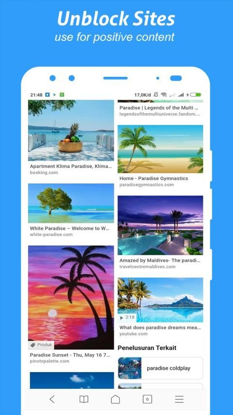 Browser Anti Blokir - Buka Blokir Tanpa VPN memberikan kamu akses untuk Buka blokir situs web atau buka blokir aplikasi favorit atau buka blokir internet positif dengan koneksi super cepat serta gratis, Dapat bekerja pada seluruh jaringan seperti jaringan LTE, 4G / 3G ( untuk provider Tri, XL, Telkomsel, Axis, IM3), WIFI ( WIFI.ID ) dan lainnya.