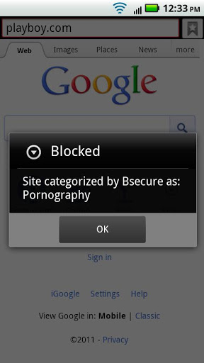 Parental Controls for the AndroidBsecure Technologies formerly Bsafeonline has produced the Nation39;s 1 Family Internet filter for over 10 years and is bringing this vast experience and technology to the Android platform.The Bsecure Mobile Browser protects Android users from accessing objectionable Web sites. This free browser prevents users from viewing sites categorized as adult Web sites or malware. It also provides a password protected local block list to block uncategorized or unwanted sites. No registration or account is required. If you have a Bsecure CloudCare account, you can access more advanced features such as custom blockallow lists, access times, reporting, additional category blocking, emailSMS notifications, password override, etc. All of these features are configured through our Webbased user interface. The extensive site list is stored on Bsecures cloud servers that have categorized millions of sites and are updated daily. This means your Android device is always up to date with the latest list, no matter where you travel.Features: Works with all home or public WiFi hotspots, 3G and EDGE networks Minimal speed delay Automatically blocks malware and adult sites Pinch amp; zoom, history, bookmarks No registrationaccount required FREE Recommend blocking the builtin browser and prevent downloading other browsers using another app such as King Kong lock