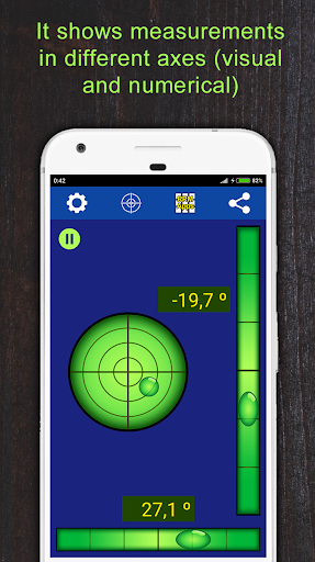 This app includes all the features of a spirit level, which allows you to measure the inclination angles of any surface or object in a simple and accurate way. It also includes a visual feature which uses the camera of your device to allow you to measure the inclination of objects seeing them on the screen.