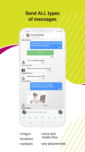 · Sending a variety of types of messages: voice, photo, video, text, smiles, gif, contacts, location, files, call recording...