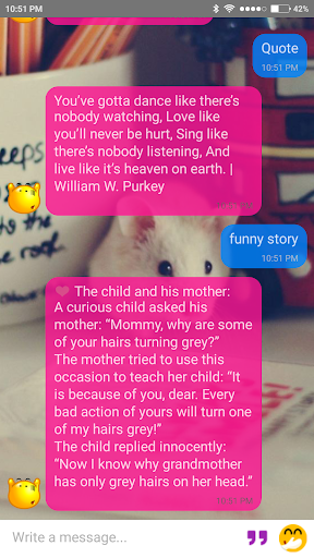 Besides, Buddy Messenger - English conversation chatbot will show you many cute pictures, good quotes and funny stories.