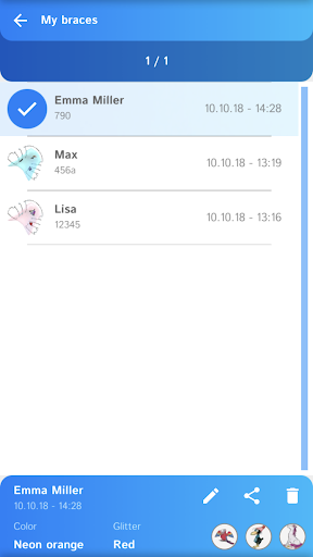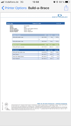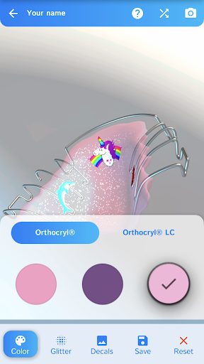 Build-a-brace will help you design your very own removable brace. Be inspired by the samples or create your own design. Or just give your smart phone or tablet a shake and see what the app comes up with! Select the color you want from the Dentaurum range of acrylics Orthocryl® and Orthocryl® LC. There are also six glitters to choose from and more than 30 decals. There is something for everyone – from a football to a unicorn!