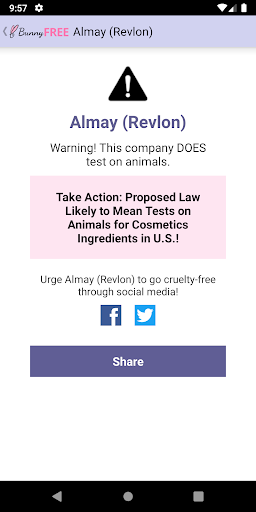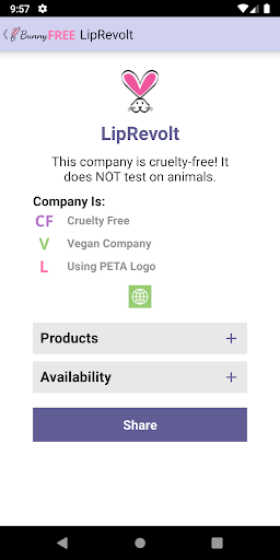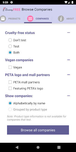 Check if a company is cruelty-free! Bunny Free lets you search for companies by name and tells you whether or not they test on animals. Browse all companies in the database, find cruelty free brands by product type, and share company testing results in version 2.0.