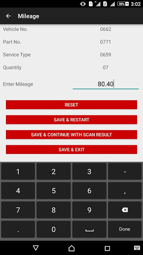 Once scanning of the above mentioned items is done, it ask you to manual entry of Mileage and presents following buttons: