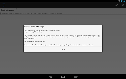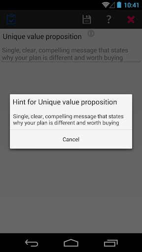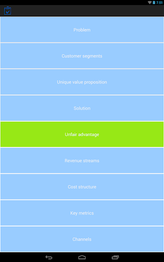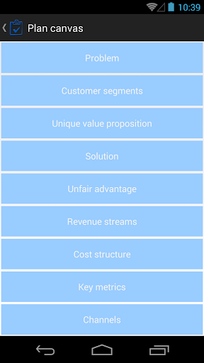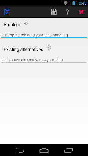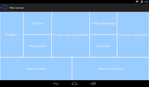 To shorten the time for first idea documentation, Alex Osterwalder came up with A4 table which we present in this app. Filling up the table, using practical and helpful hints, you will go through all important steps of a real business plan.