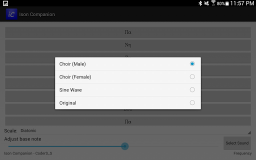 Do you enjoy Byzantine Chanting when you are alone? Try Byzantine Ison. This application provides a natural sounding tone, smooth transitions between notes, the ability to pick any frequency as your base note, seven scales to choose from, and a Scale Manager allowing users to edit, create, and delete scales. Byzantine Ison is the only application that provides these services at no cost and without advertisements.