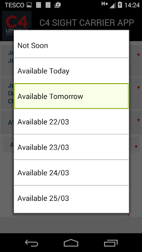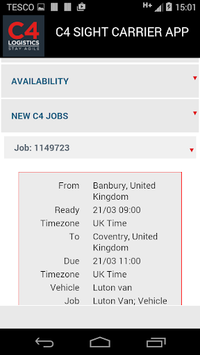 Users of this application can update C4 Logistics with details of completed job milestones and the current location of the vehicles. If they are doing a job for someone else the app allows them to send C4 Logistics the details of their next availability.