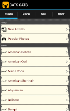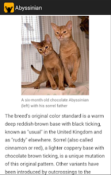 The app includes many breeds such as American Bobtail, Maine Coon, British Shorthair, Abyssinian, Balinese, Bengal, Cornish Rex, Egyptian Mau, Himalayan, Manx, Munchkin, Persian, Russian Blue, Siamese, Siberian etc.