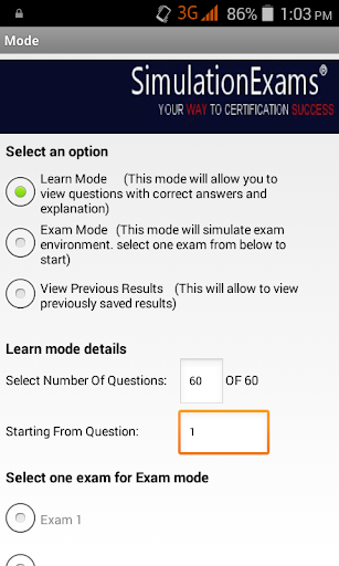 Complete explanation is provided for each question in Learn mode, and actual exam environment is simulated in Exam mode. Options to save the results and reviewing questions are provided.