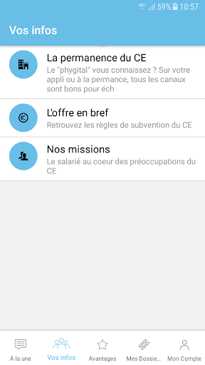 Vous souhaitez être informés en temps réel sur les actions de votre CE et les nouvelles offres en ligne. Les rubriques « A la une » et « vos infos », vous permettent d’accéder aux comptes-rendus de votre CE, à son agenda et à toutes les nouveautés et actualités du bureau.