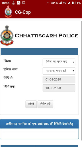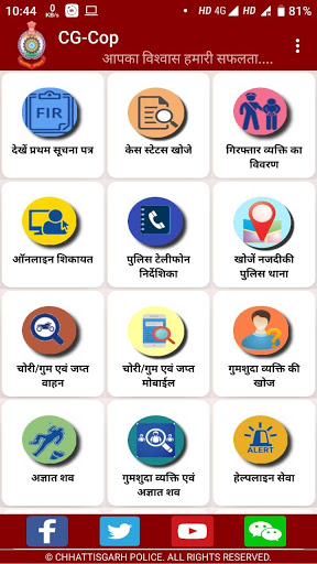 CG-Cop mobile application is a social initiative by CG Police Department for citizens. This app contains various services which are directly helpful to citizen as per their requirement. Citizen can view the required data as well raise request like complaint, etc. directly to CG police department without personally visit to any police station or other offices under CG Police Department.