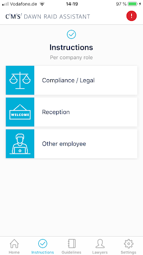 • Emergency button: direct call or e-mail to your selected country’s local dawn raid team