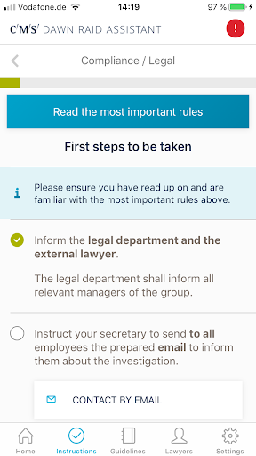 In order to put Your World First, we have put together the CMS dawn raid package of a checklist, instructions and guidelines across 27 CMS countries and combined those into our new mobile application that can be always at hand. That combined with a new specially developed alert feature to contact CMS dawn raid lawyers at the touch of a button, so you can feel secure knowing that we are there for you.