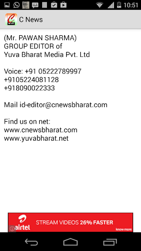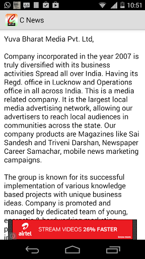 Yuva bharat Media Private Limited is a media hub consisting Career Samachar (a Hindi weekly news paper), C NEWS (A complete Web News Portal Mobile Media Networking) and Triveni Darshan (Spiritual Hindi Monthly Magazine). Yuva Bharat Media Private Limited is maintaining a strong readership in all across Uttar Pradesh along with some specific parts of Bihar, Uttarakhand , Madhya Pradesh, Chattisgarh and Jharkhand.