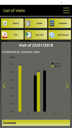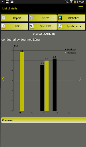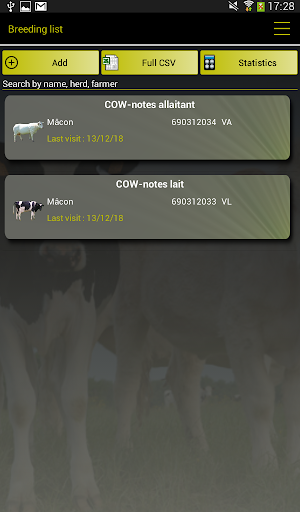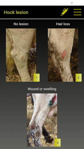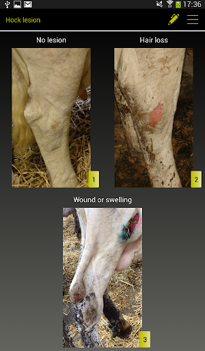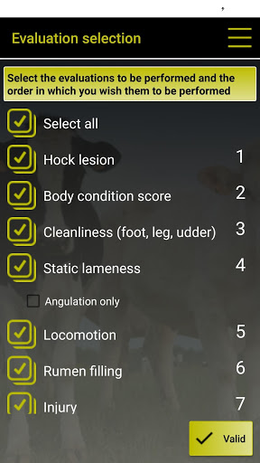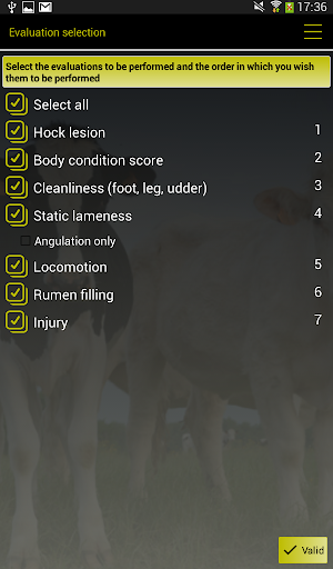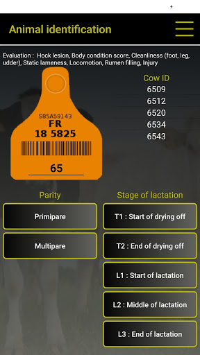 Based on the published interpretation grids, COW notes works on the comparison between the proposed photos by the software and what the user sees in the assessed cow. The user just needs to click on the photo which is the most resembling of what he observes to have a precise notation of assessed criterion. They can be identified by their official number or only by their parity (Primiparous-Multiparous) and their physiological stage, for dairy cows. Special grids are used for B.C.S. of Holsteins, Montbeliardes and beef cattle, and for Cleanliness scores for dairy cows (assessment of Feet, Udder and Leg cleanliness) and beef cattle (official grid IDELE).