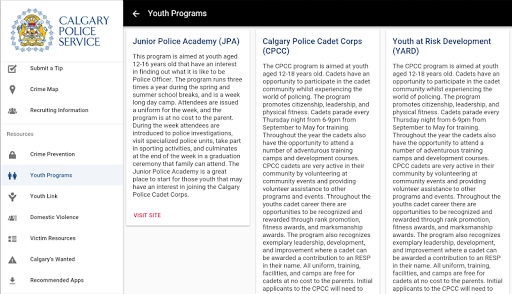 • Resource links for crime prevention, youth programs, domestic violence, victim resources and Calgary’s Wanted list.